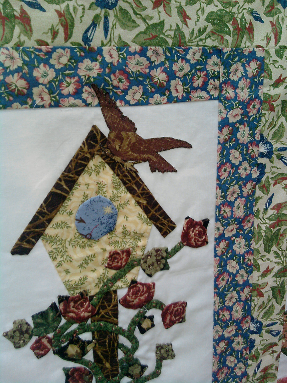 Colores de Otoño también para su Casita Pajarera, con fondo de un acolchado muy derechito (¡que envidia!. A mi no me sale eso ni con regla...), otro pajarillo cotilla esperando para poder entrar, y una bordura de telas floreadas la mar de románticas..